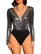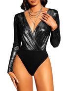 Wrap Ruched Deep V Neck Black Glitter Long Sleeve Bodysuit